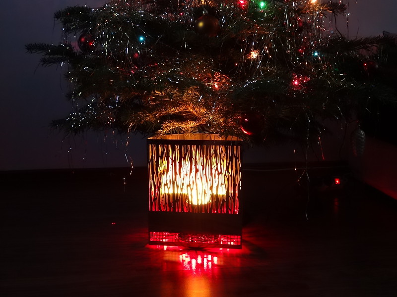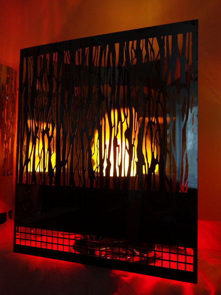 Šajā plakanā lampā liesma atspoguļojas uz visas aizmugurējas sienas un aizpilda visu lampu ar "uguni", tāpēc tā izskatās pēc īsta kamīna.