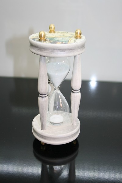 "TreEsse" baltās kolekcijas sastāvā ietilpstošs klasiskā stilā ieturēts smilšu pulkstenis gaiša koka ietvarā ar zelta krāsas elementiem un antīkas pasaules kartes fragmentu. Izdaiļos jebkuru interjeru.